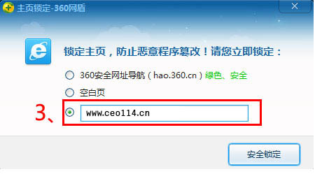 在弹出的提示窗中点击下图所示的位置,输入www.ceo114.cn ,再点击“安全锁定”按钮,完成设置。